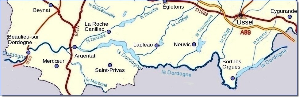 Communes bordant la Dordogne en Corrèze du nord au sud sur la rive gauche Singles (Cantal), Larrode (Cantal), Labessette (Cantal), Beaulieu (Cantal), Champagnac (Cantal), Lanobre (Cantal), Bort-les-Orgues, Madic (Cantal), Saint Pierre (Cantal), Veyrières (Cantal), Arche (Cantal), Chalvignac (Cantal), Rilhac-Xaintrie, Auriac, Bassignac le Haut, Servières-le-Château, Hautefage, Argentat, Monceaux-sur-Dordogne, Bassignac-le-Bas, Altillac et Gagnac-sur-Cère (lot)