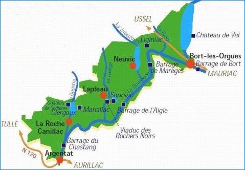 Communes bordant la Dordogne en Corrèze du nord au sud sur la rive droite Confolent-Port-Dieu, Monestier-Port-Dieu, Sarroux-Saint Julien, Bort-les-Orgues, Roche-le-Peyroux, Ste Marie Lapanouse, Liginiac, Sérandon, Neuvic, Latronche, Soursac, Laval sur Luzège, St-Merd-de-Lapleau, Marcillac-la-Croisille, Gros Chastang, Saint-Martin-la-Méanne, Saint Martin-Entraygues, Argentat, Monceaux-sur-Dordogne, Chenailler-Mascheix, Brivezac, Beaulieu-sur-Dordogne, Astaillac et Liourdres.