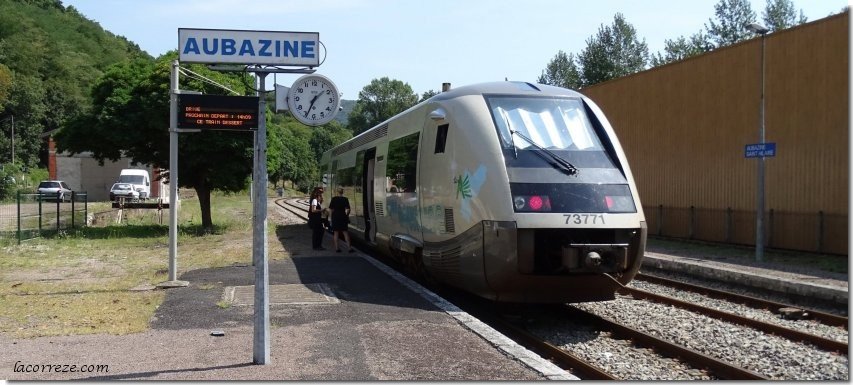 Le bâtiment de la gare à été détruit. La route D 48 située de l'autre côté du pont sur la commune de Dampniat permet d'accéder au village d'Aubazine situé au dessus de la vallée. La gare d'Aubazine était le point de départ du tramway de la Corrèze , la ligne Aubazine - Beaulieu ouvert le 01/12/1912 qui a été fermé le 01/01/1932.